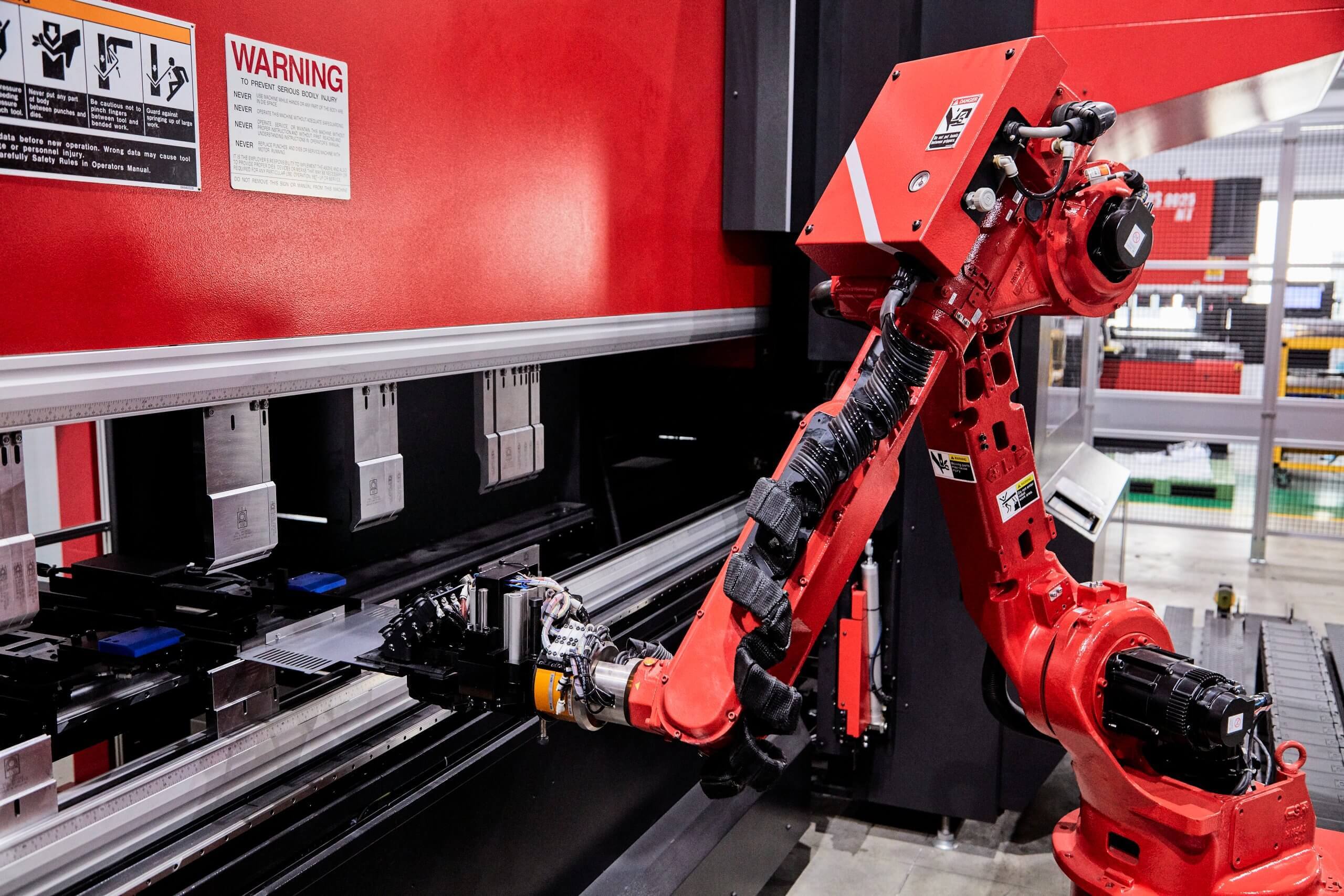 In addition to manual manufacturing, BLIKSEN also utilizes robotic arms capable of meeting customers' sheet metal tolerance requirements. Pictured is an automated press brake machine in BLIKSEN's facility.